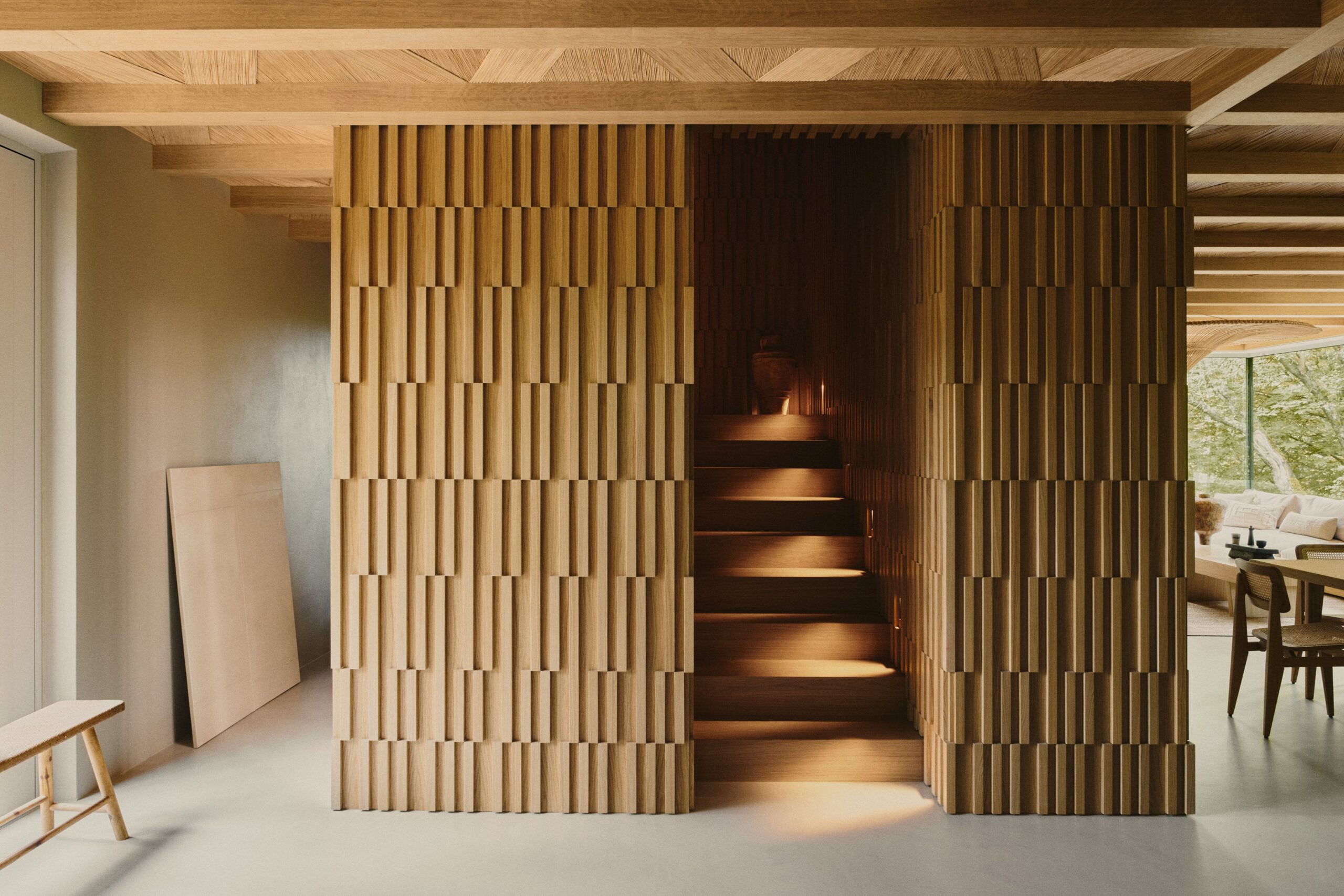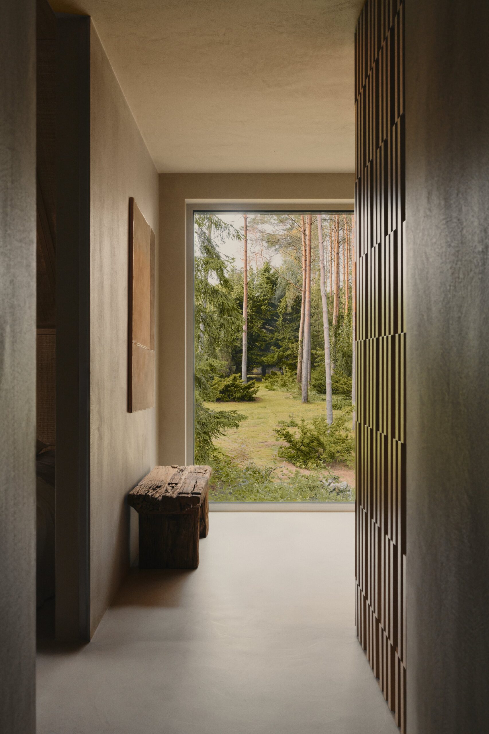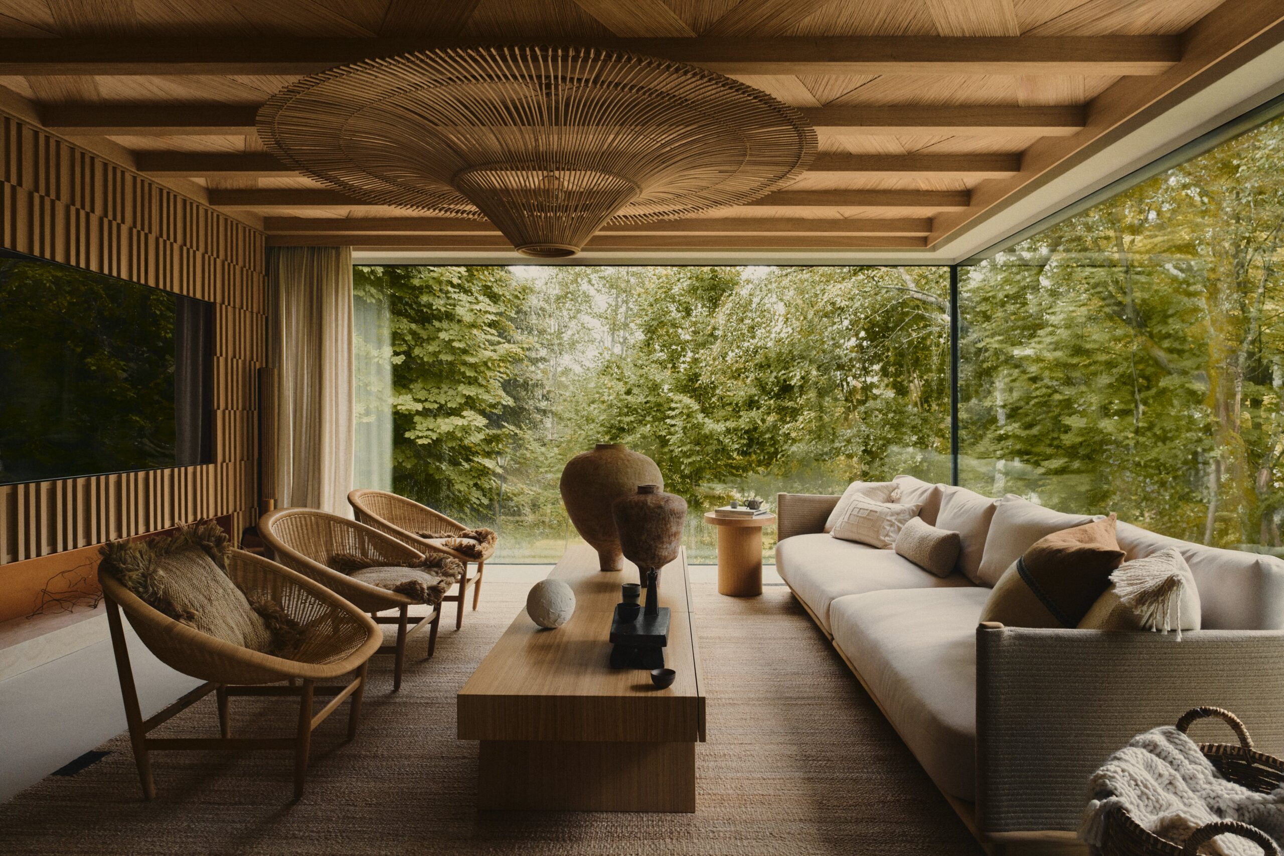 Minimalism, harmony, tranquility, a sense of warmth, and unity with nature—these are the defining features of this holiday oasis, nestled among the Masurian forests, far from the hustle and bustle of the city. The residence is distinguished by simplicity of form, a cohesive color palette, and a selection of natural materials that blend seamlessly with the idyllic natural surroundings. The materials used in the design contrast with one another, forming a harmonious whole. The omnipresence of wood, along with natural accents such as ceramics, lighting, and bas-reliefs, imparts a warm character to the space. Meanwhile, concrete and shades of grey add texture, creating a balance between the raw materials used.
