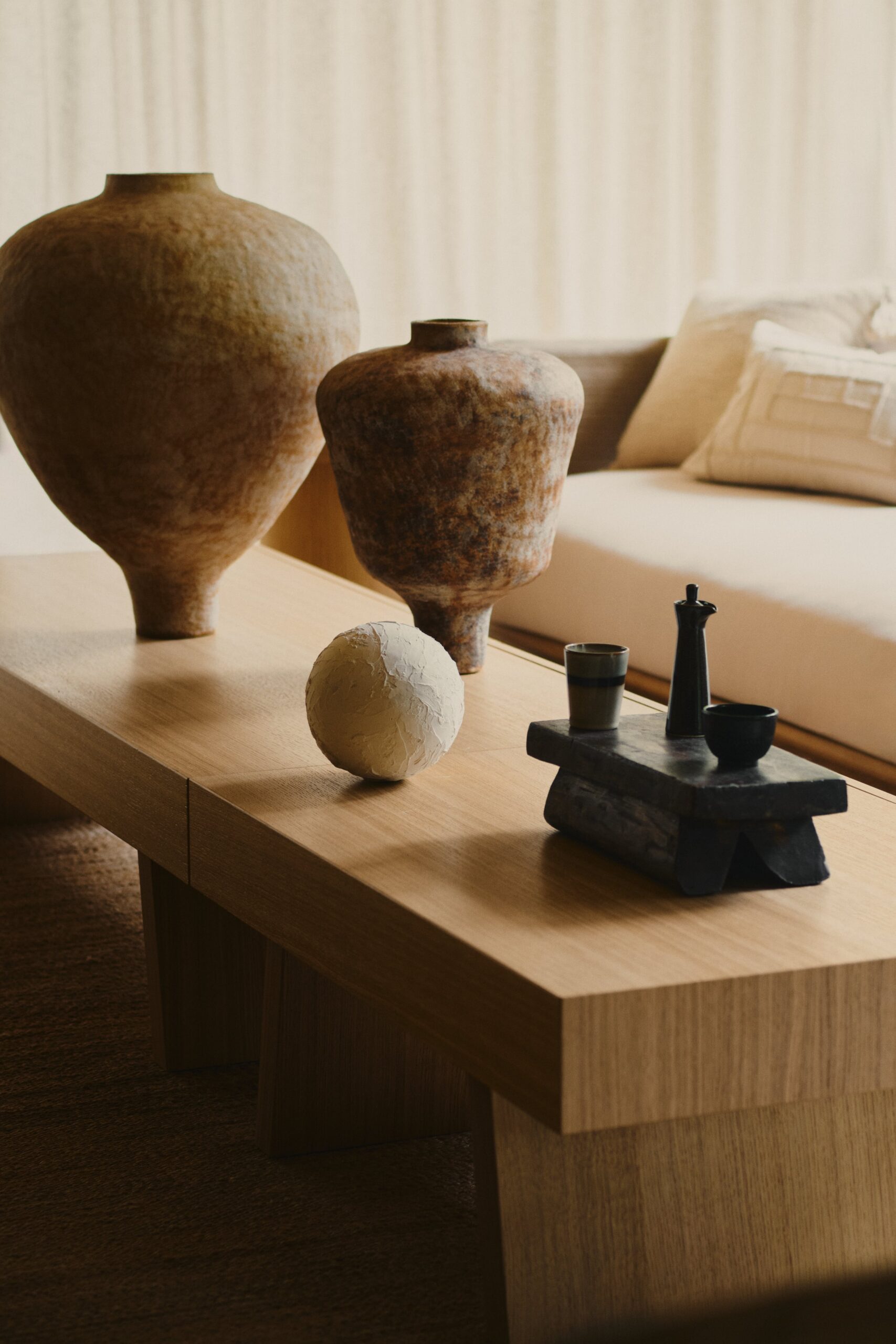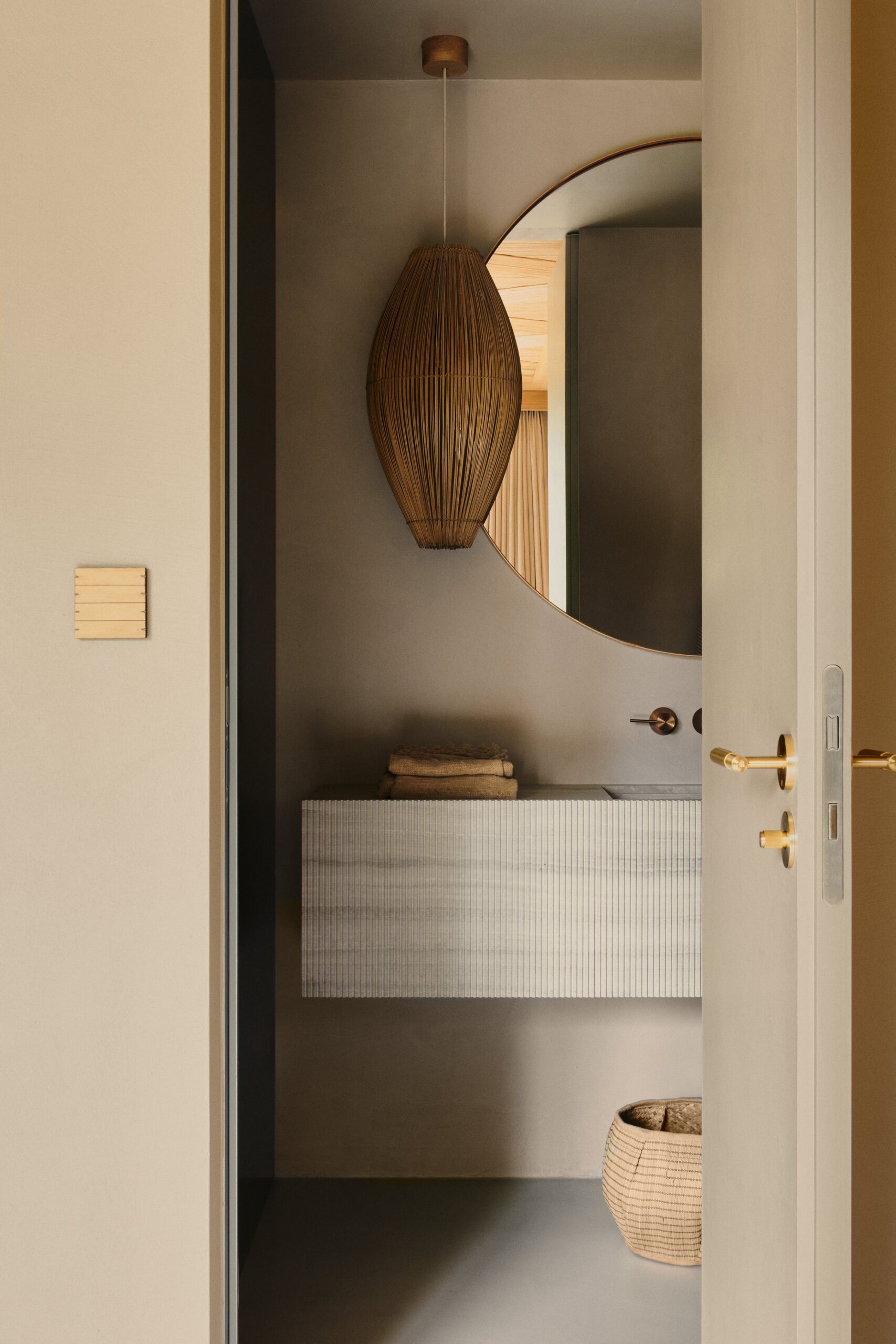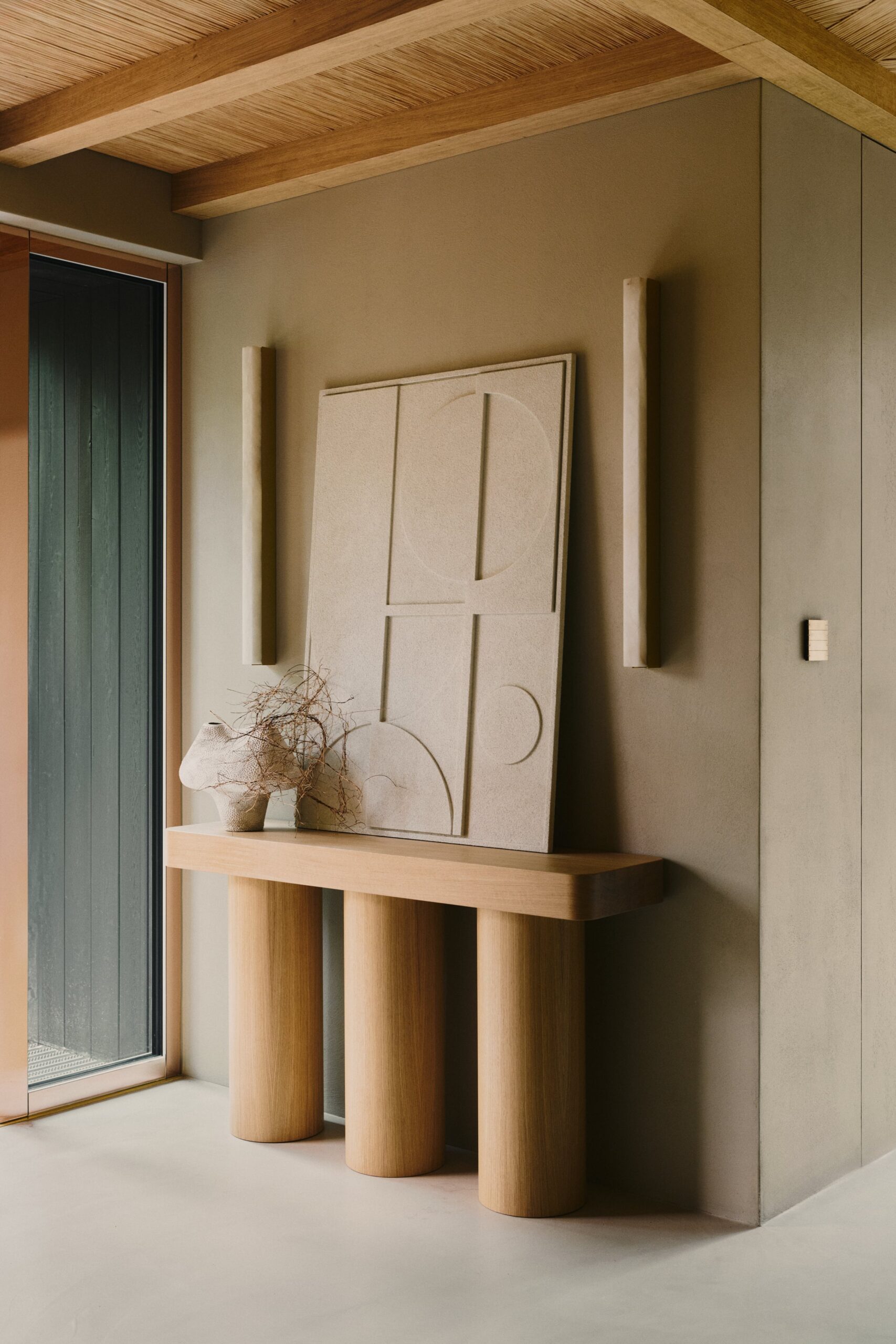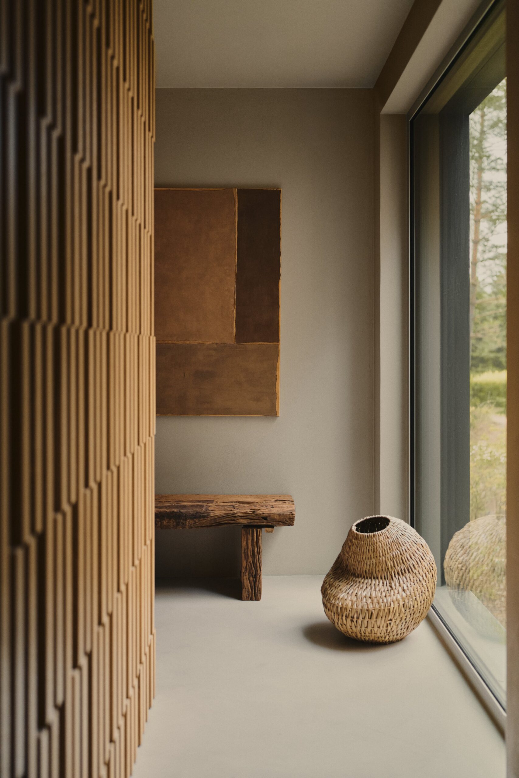 Minimalism, harmony, tranquility, a sense of warmth, and unity with nature—these are the defining features of this holiday oasis, nestled among the Masurian forests, far from the hustle and bustle of the city. The residence is distinguished by simplicity of form, a cohesive color palette, and a selection of natural materials that blend seamlessly with the idyllic natural surroundings. The materials used in the design contrast with one another, forming a harmonious whole. The omnipresence of wood, along with natural accents such as ceramics, lighting, and bas-reliefs, imparts a warm character to the space. Meanwhile, concrete and shades of grey add texture, creating a balance between the raw materials used.