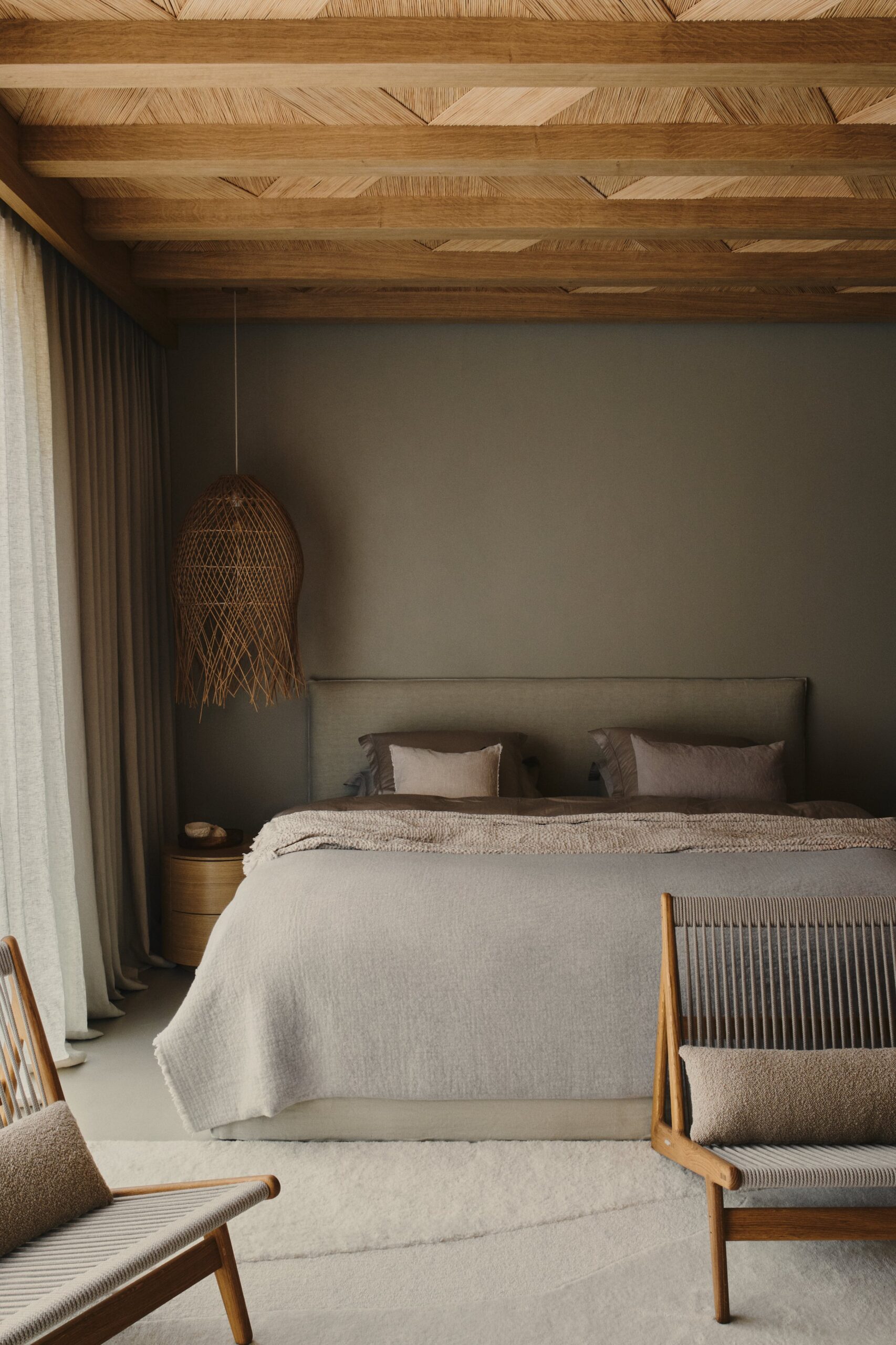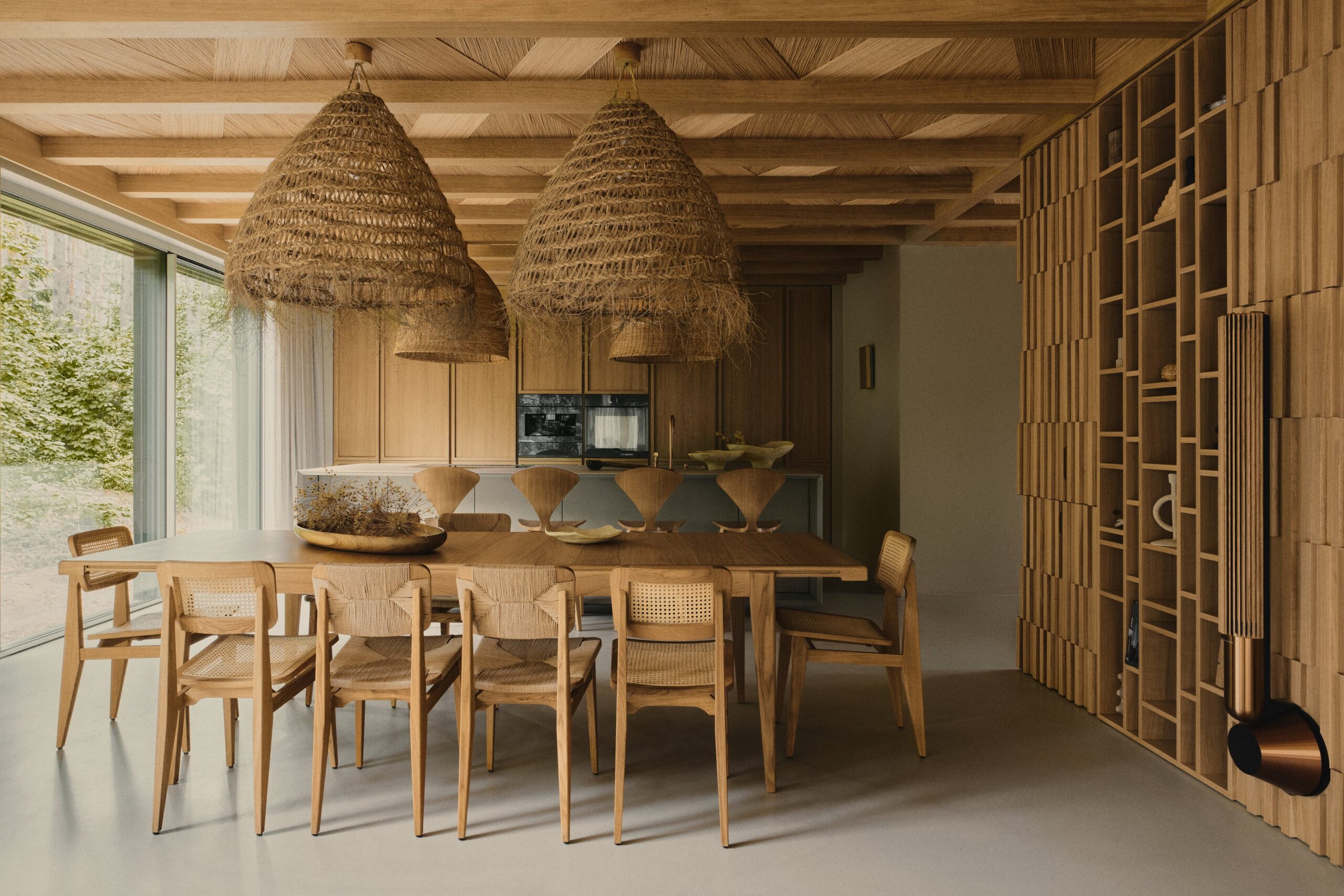Architektura, Warszawa, Berlin.Minimalism, harmony, tranquility, a sense of warmth, and unity with nature—these are the defining features of this holiday oasis, nestled among the Masurian forests, far from the hustle and bustle of the city. The residence is distinguished by simplicity of form, a cohesive color palette, and a selection of natural materials that blend seamlessly with the idyllic natural surroundings. The materials used in the design contrast with one another, forming a harmonious whole. The omnipresence of wood, along with natural accents such as ceramics, lighting, and bas-reliefs, imparts a warm character to the space. Meanwhile, concrete and shades of grey add texture, creating a balance between the raw materials used.