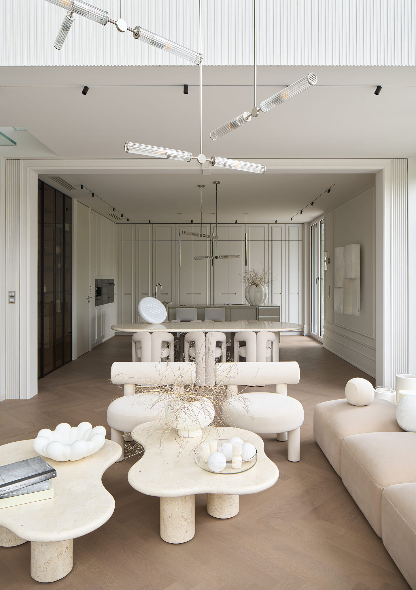 Architektura, Warszawa, Berlin.W naszym najnowszym projekcie Modern Elegant Warsaw, daj się porwać oszałamiającemu projektowi tego przestronnego, otwartego wnętrza w ciepłej bieli i beżu. Otwarta koncepcja salonu pozwala na płynne przejście między różnymi obszarami przestrzeni, tworząc poczucie harmonii i połączenia. Klatka schodowa o smukłych liniach i nowoczesnym wzornictwie dodaje element wyrafinowania i elegancji do ogólnej estetyki.